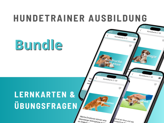 Lernkarten und Übungsfragen sind eine zusätzlich Lernhilfe für angehende Hundetrainer:innen, um sich optimal auf die Prüfung beim Veterinäramt nach §11 TierSchG vorzubereiten. Damit festigst du dein Wissen nachhaltig und kannst dein Wissen jederzeit überprüfen.